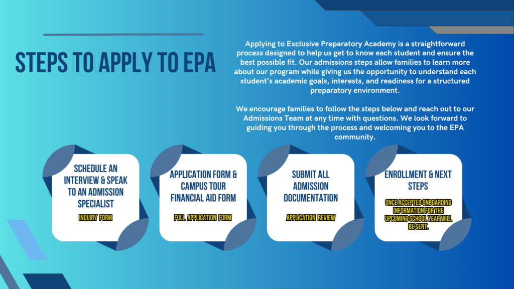 Please Note: Exclusive Preparatory Academy™ does not discriminate on the basis of race, color, religion, sex, sexual orientation, gender identity or expression, national or ethnic origin, disability, or any other characteristic protected by law in the administration of its admissions policies or educational programs.